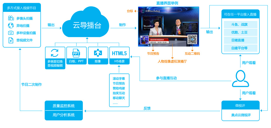 奥点云云导播台服务LCPS (Live Content Produce Service),是一种即开即用的在线直播视频即时制作系统,支持抠像、H5场景加入、多路画面切换等多项功能,适用于新媒体、在线教育、在线医疗、电商、金融等业务。