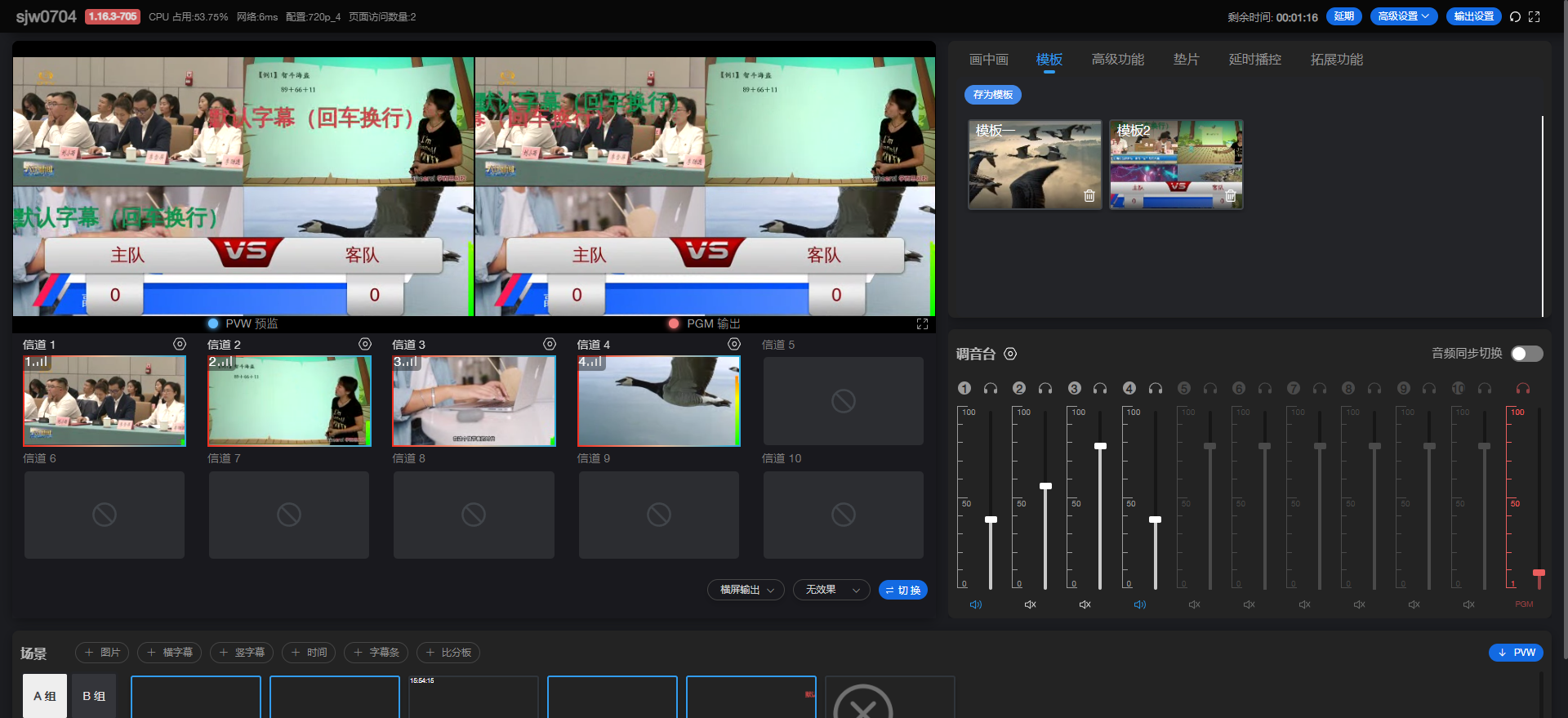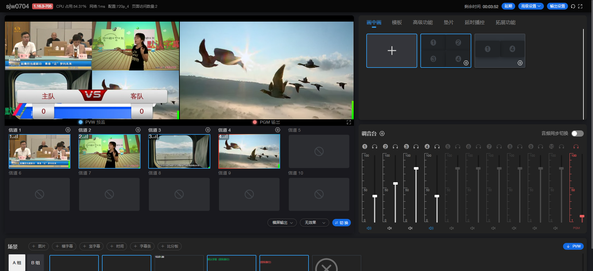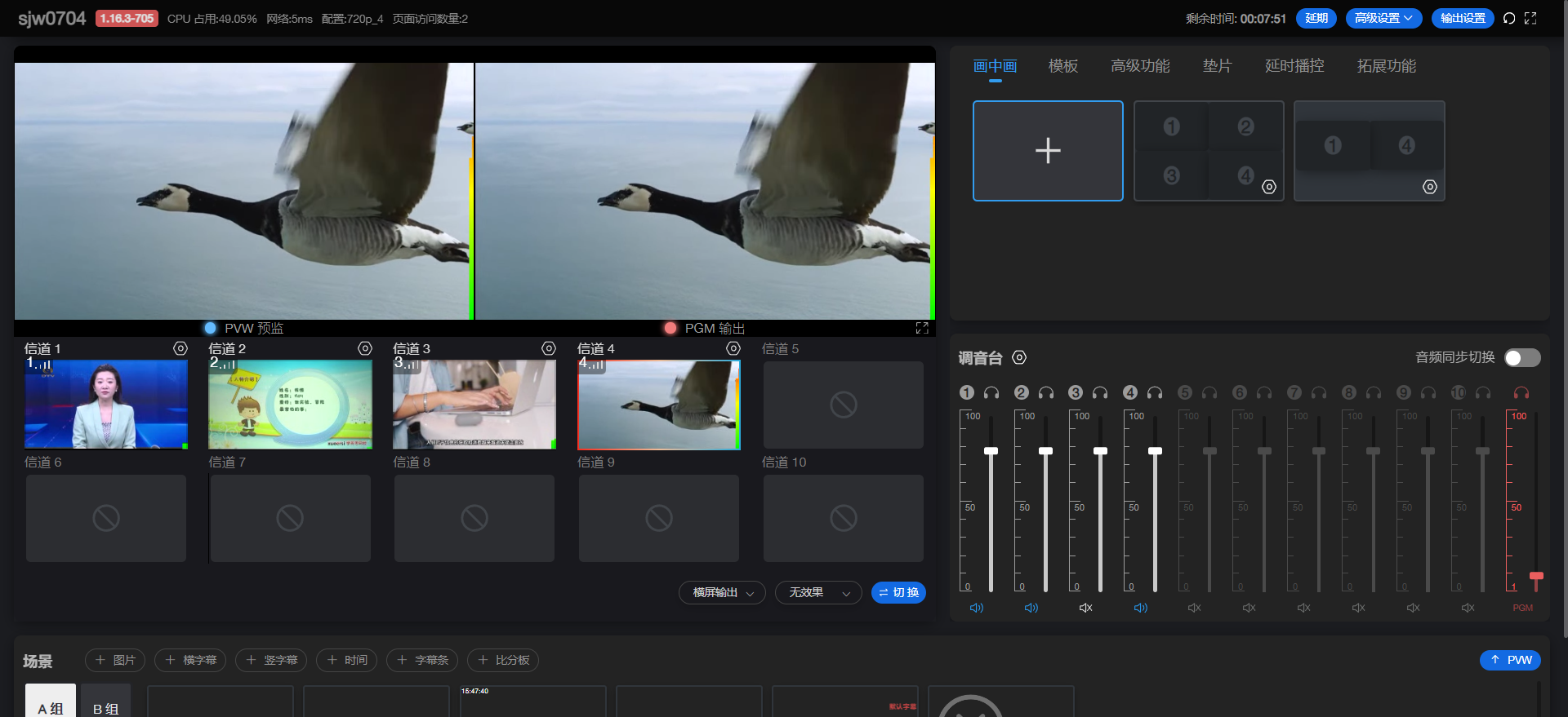 1.拉入流,应用了画中画、添加了场景,将调音台音量调整了一下