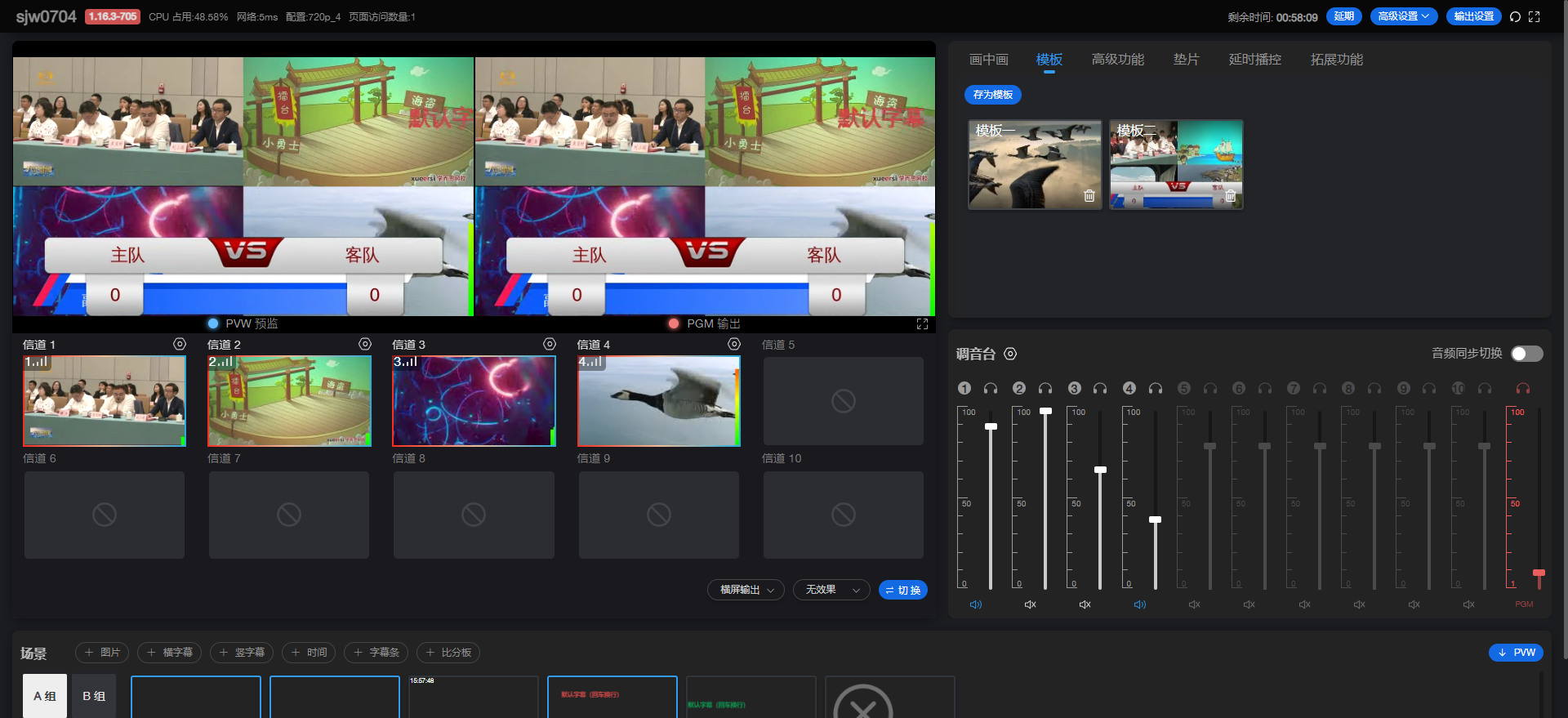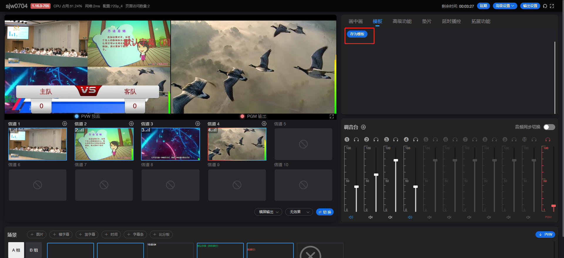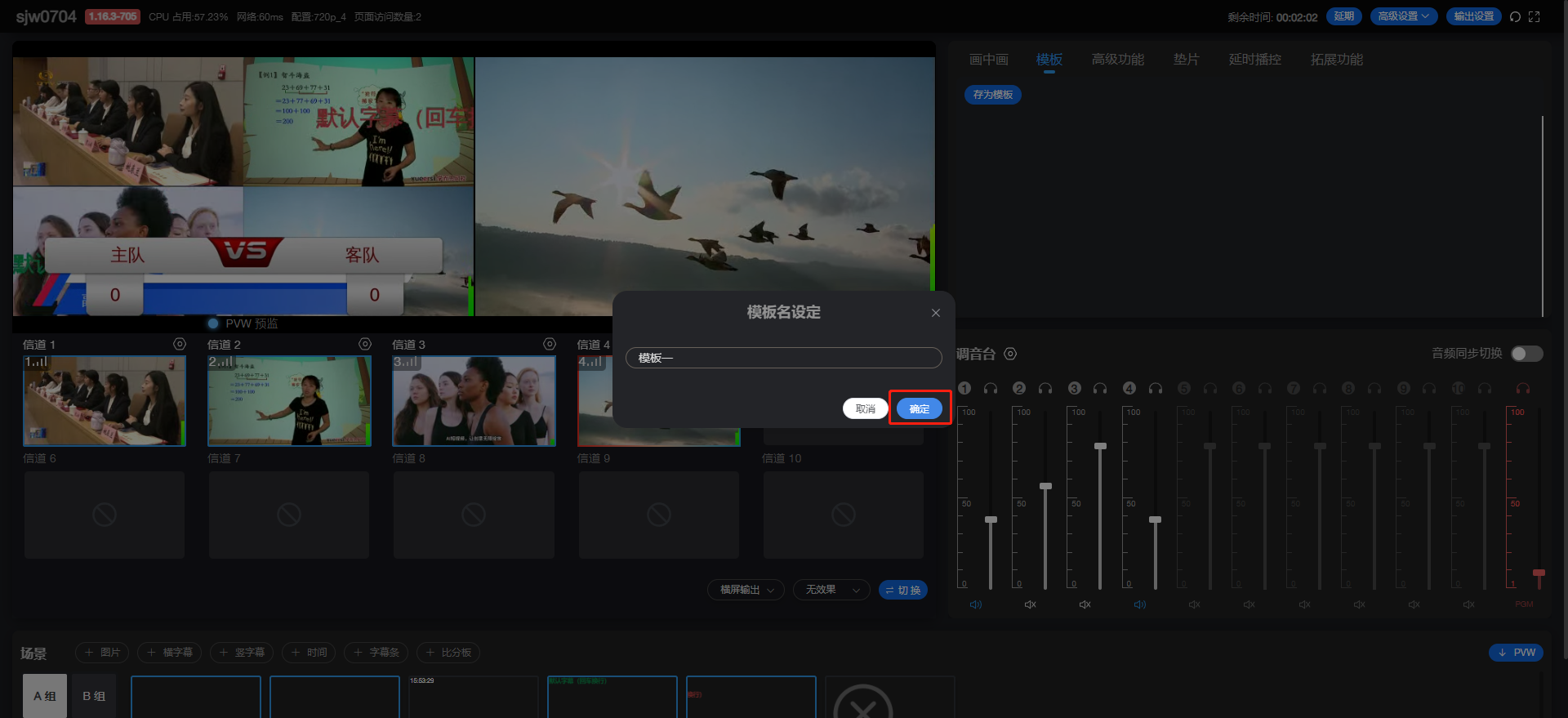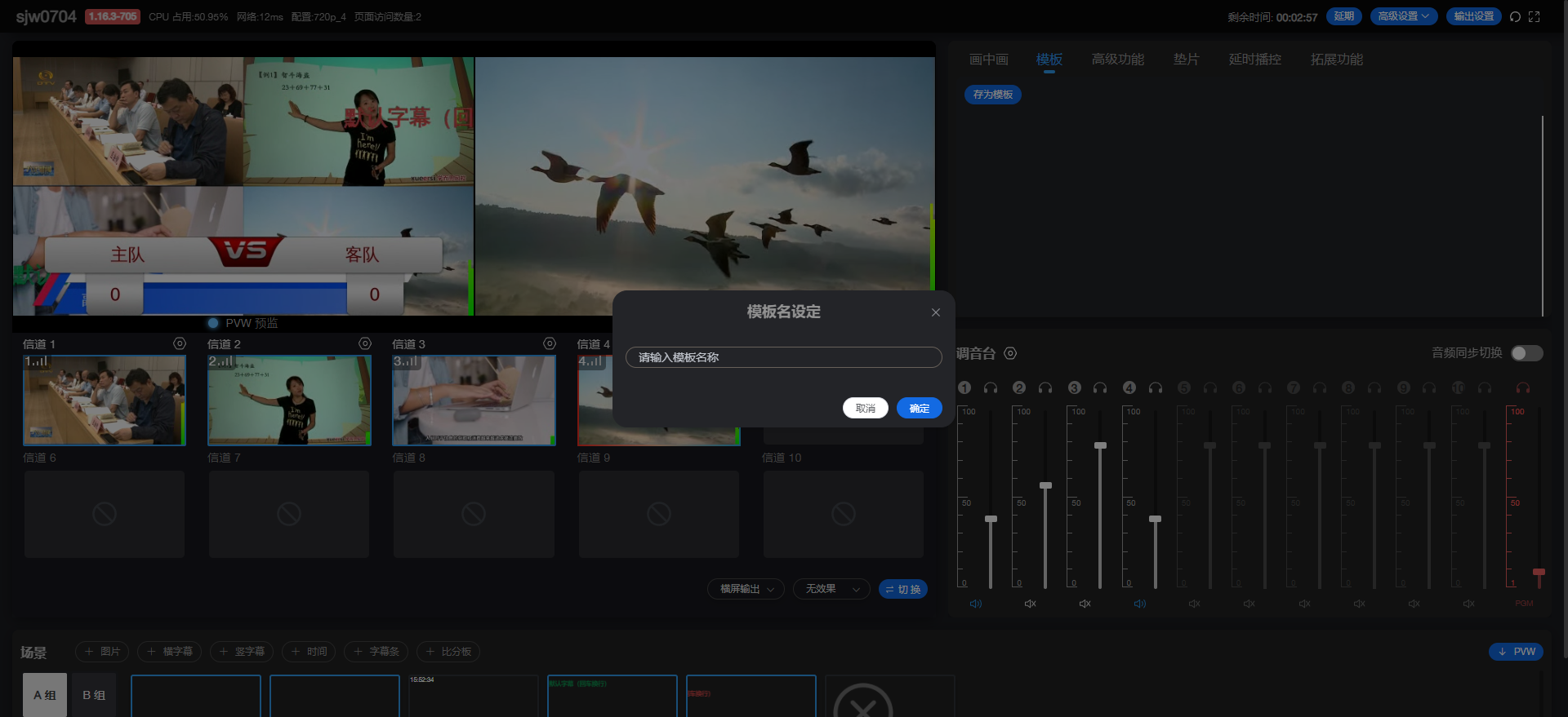 1.拉入流,应用了画中画、添加了场景,将调音台音量调整了一下