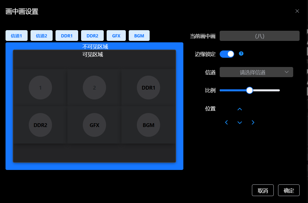 已经预制了10种画中画的效果,用户可以根据场景需求,点击设置按钮,任意调整各信道的比例、大小和位置