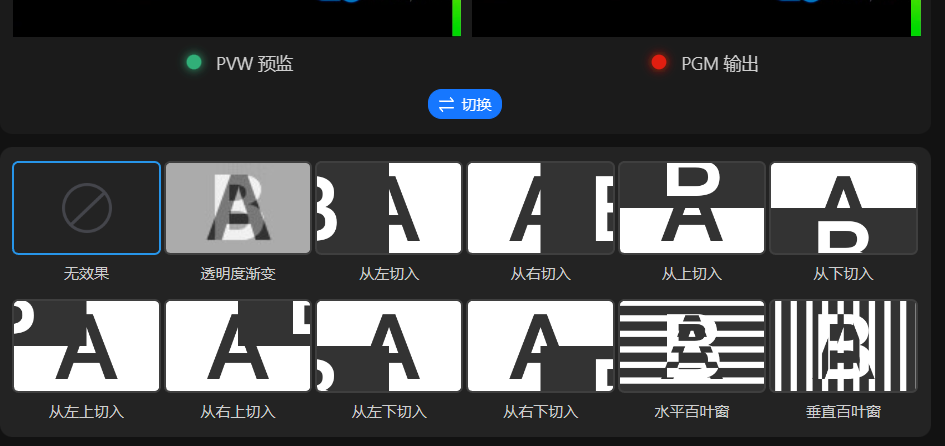 选择一个效果点击切换,pvw上的效果即可切换到pgm上