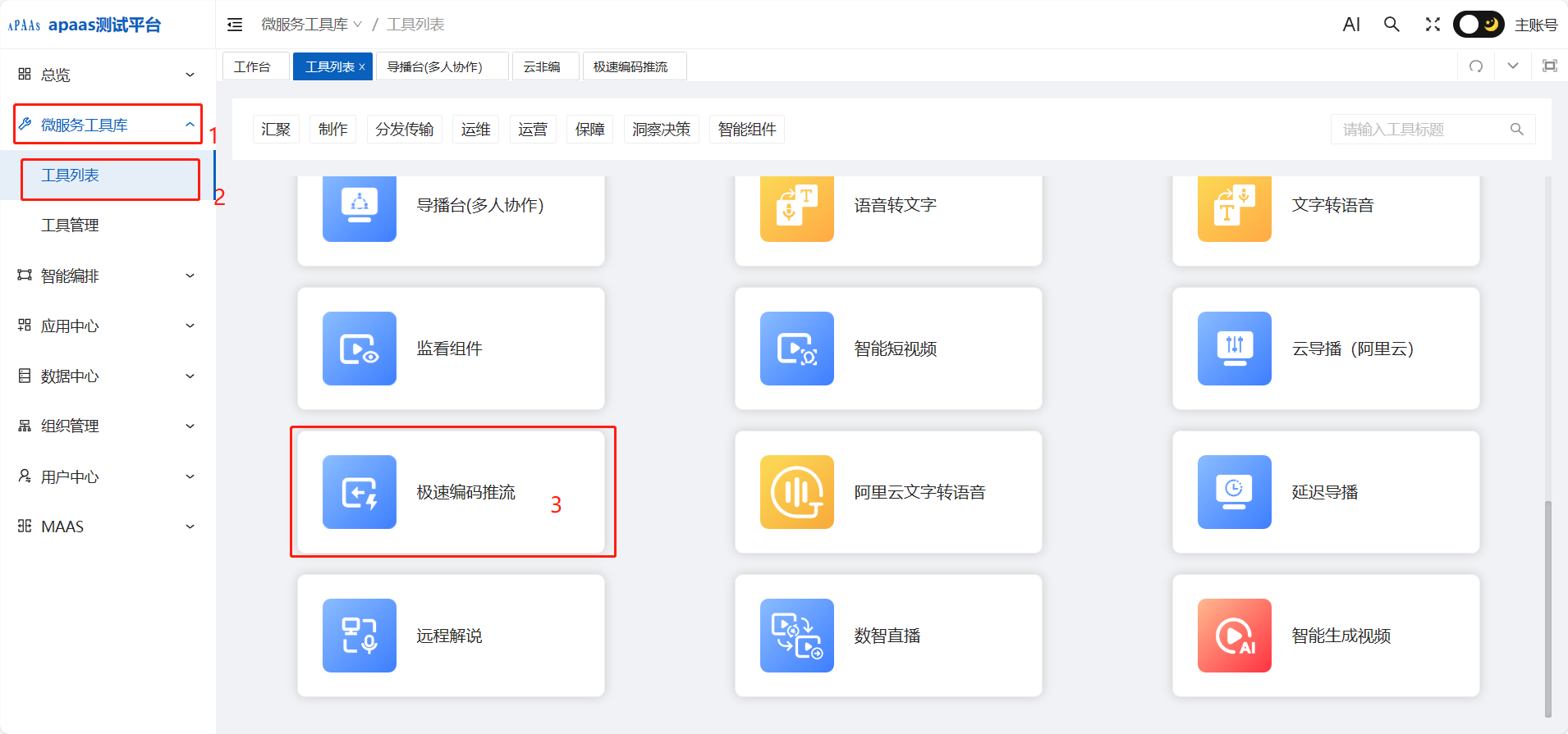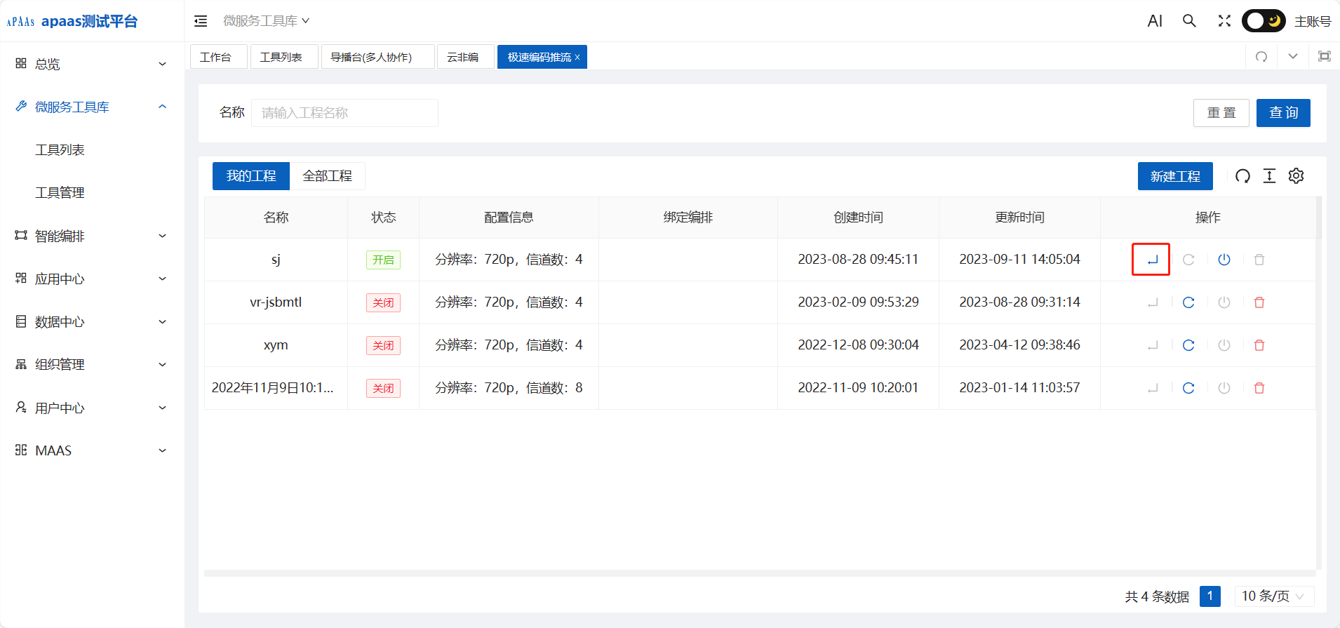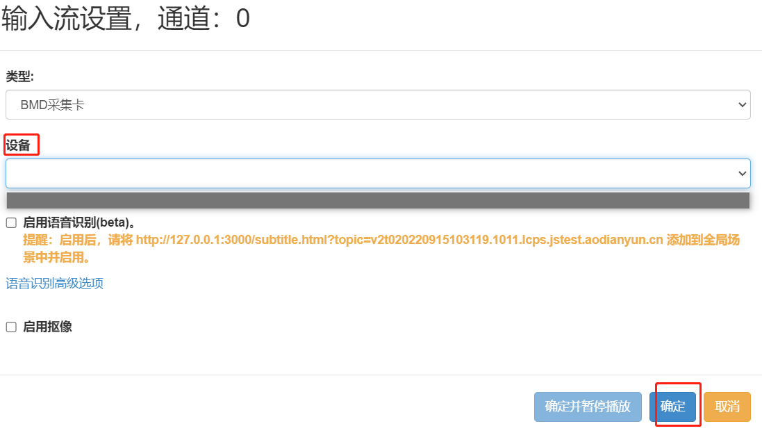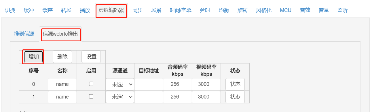方法一方法二打开极速推流组件,进入一个工程选择拉流和拉流地址或者采集卡和设备,输入目标地址,点击推流,保存配置进行推流 方法三1.打开网页2.点击进入服务 3.点击 4.信源拉流 5.拉流 选择设备。点击确定虚拟编码器——信源webrtc推出——增加设置信源的源通道——配置目标地址——点击设置即可生效目标地址固定为//lpsplay.cuc.aodianyun.cn/apaas1011/test1 在多人协作导播台输入极速流拉流地址:拉极速流作者:shangjun 创建时间:2022-09-15 10:38最后编辑:shangjun 更新时间:2023-09-11 14:35