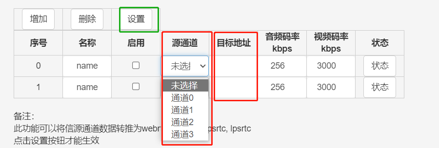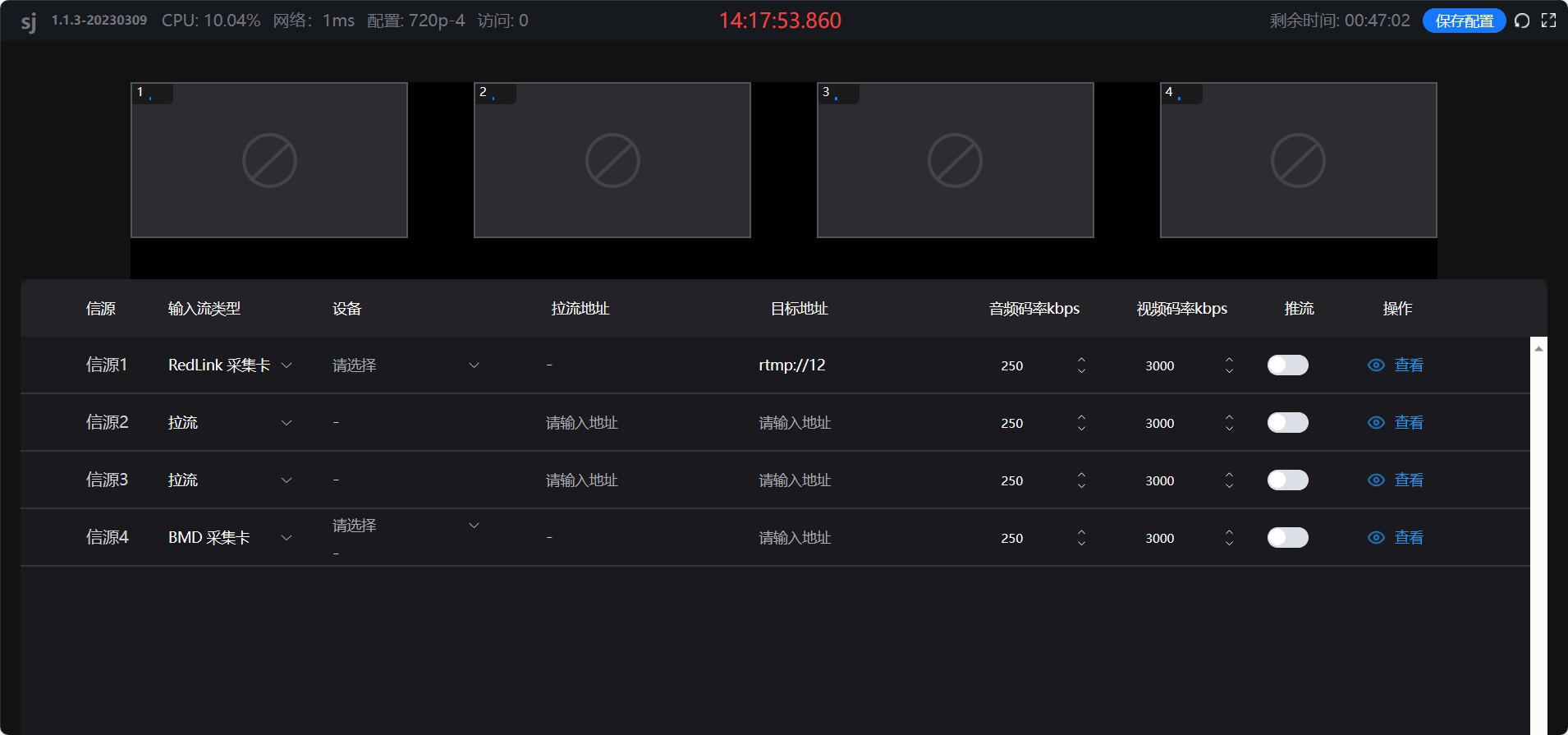 目录 搜索 展开 导播切换图文包装字幕系统调音台远程解说云非编极速编码推流4k推流配置IP4k高码流 暂无相关搜索结果! 极速编码推流 方法一方法二打开极速推流组件,进入一个工程选择拉流和拉流地址或者采集卡和设备,输入目标地址,点击推流,保存配置进行推流 方法三1.打开网页2.点击进入服务 3.点击 4.信源拉流 5.拉流 选择设备。点击确定虚拟编码器——信源webrtc推出——增加设置信源的源通道——配置目标地址——点击设置即可生效目标地址固定为//lpsplay.cuc.aodianyun.cn/apaas1011/test1 在多人协作导播台输入极速流拉流地址:拉极速流作者:shangjun 创建时间:2022-09-15 10:38最后编辑:shangjun 更新时间:2023-09-11 14:35